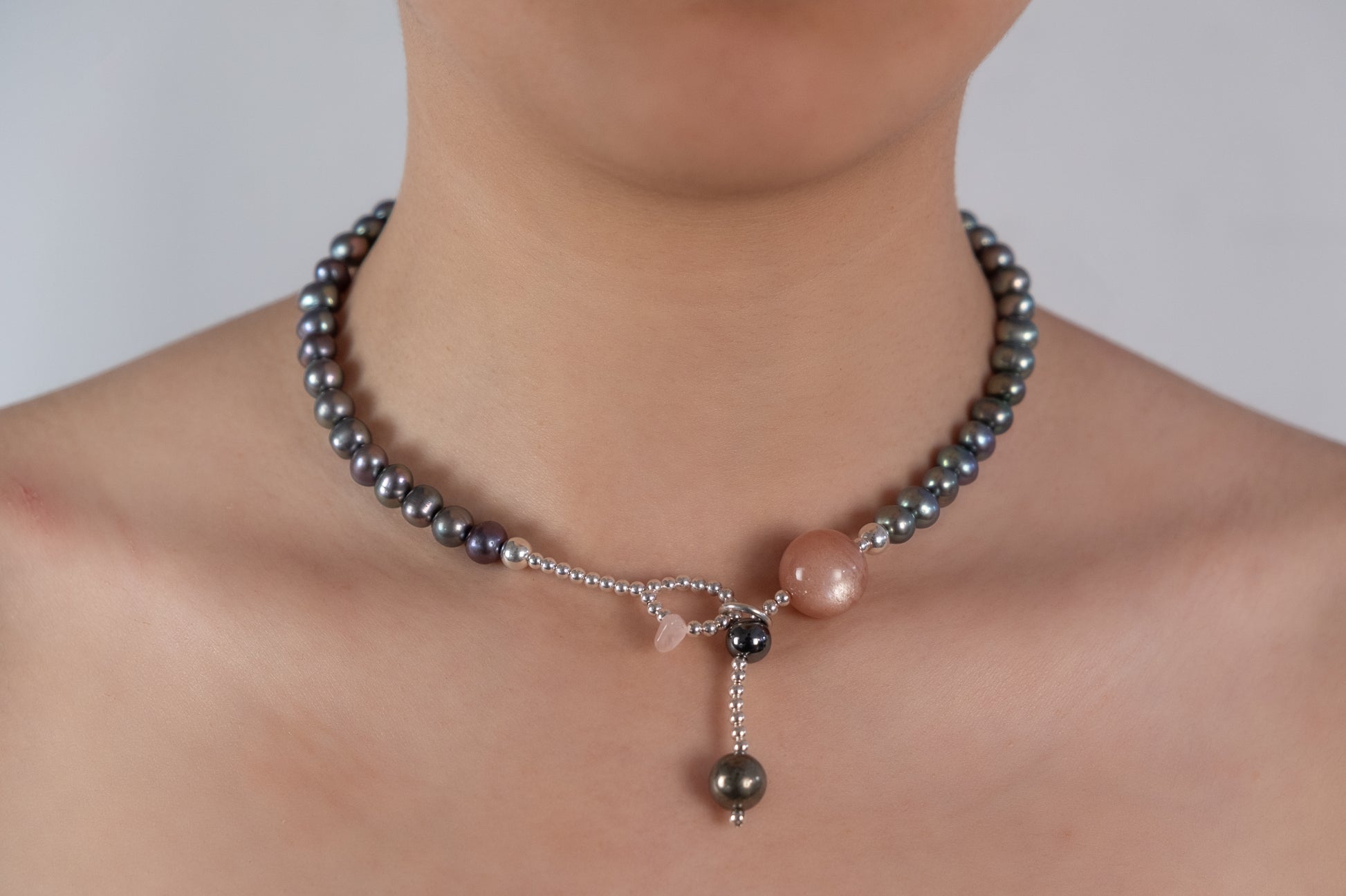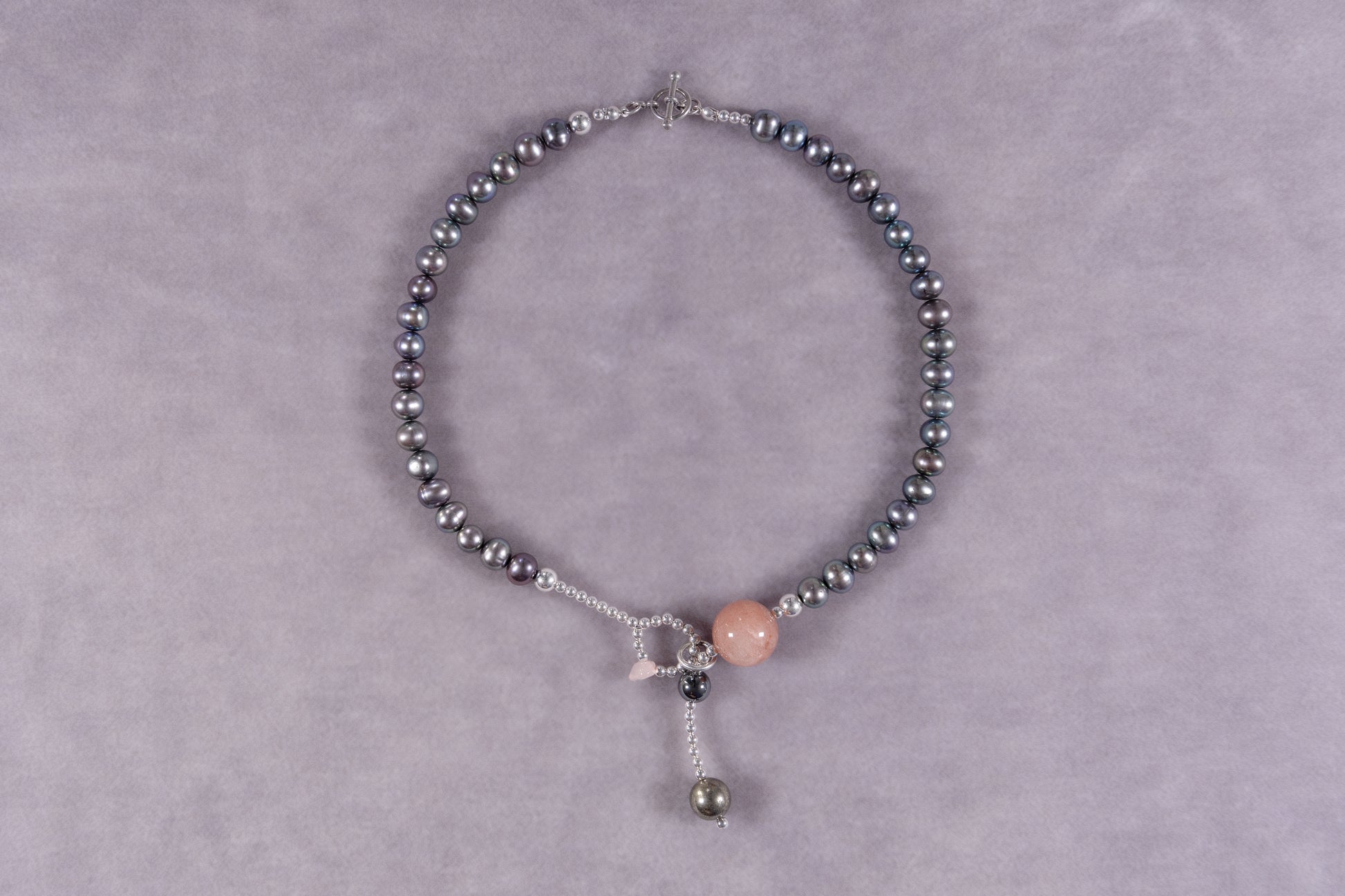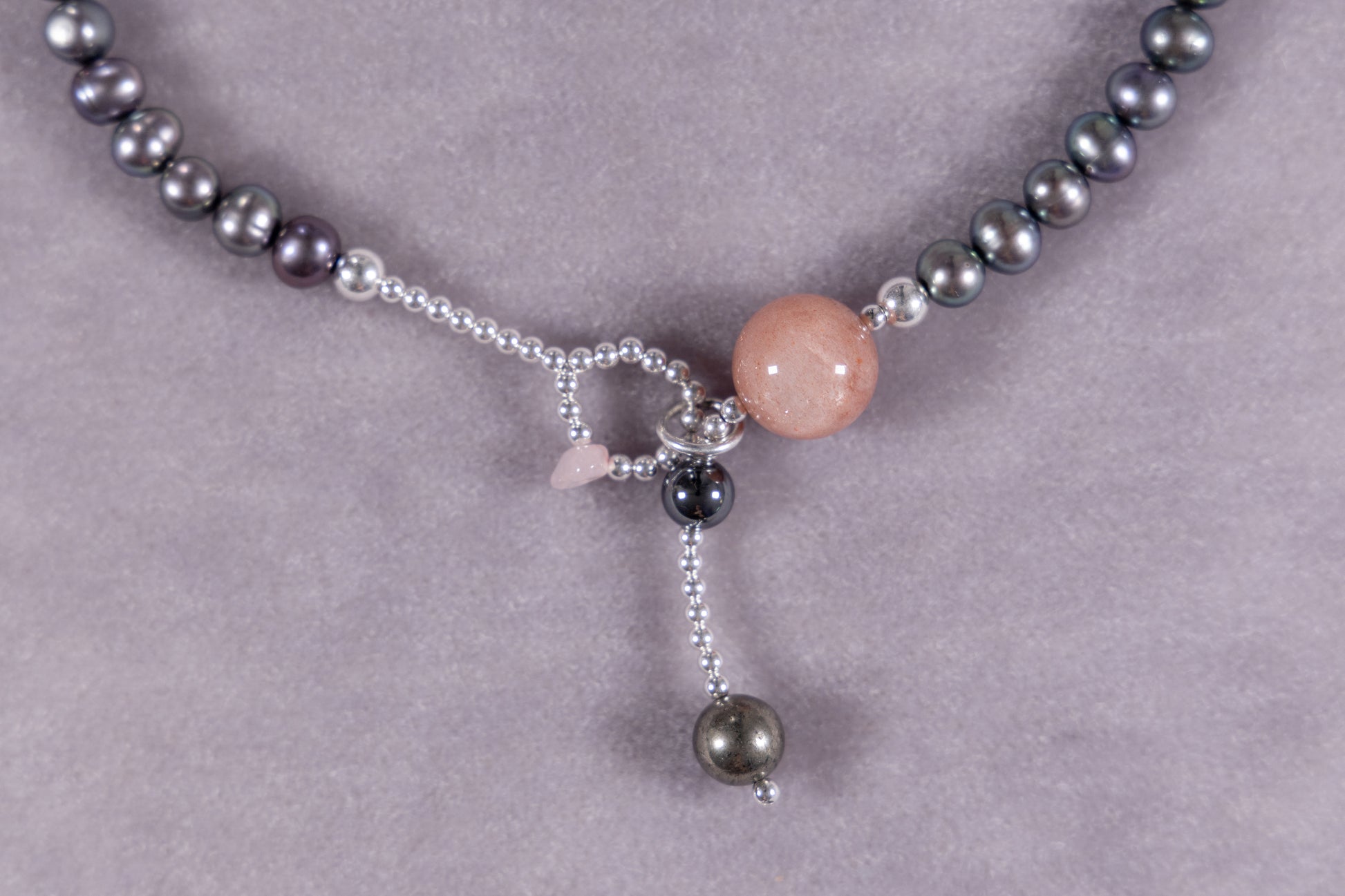 silver, cultured pearl, sun stone, rose quartz, pyrite, hematite.