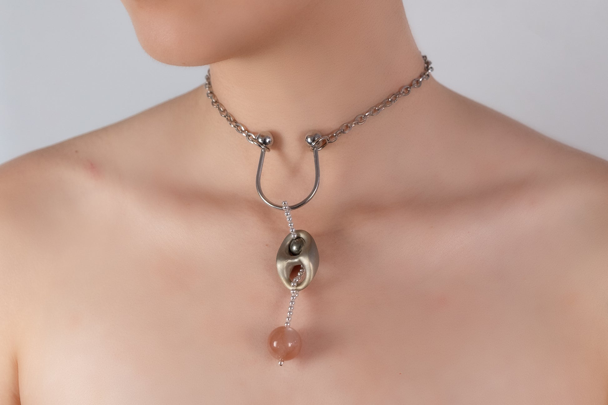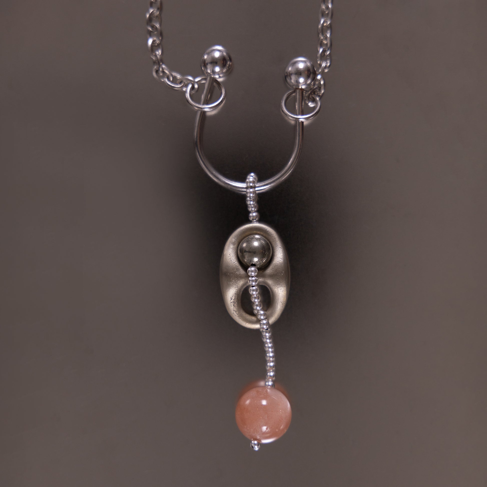 stainless steel, white bronze, silver beads, pyrite, sun stone.
