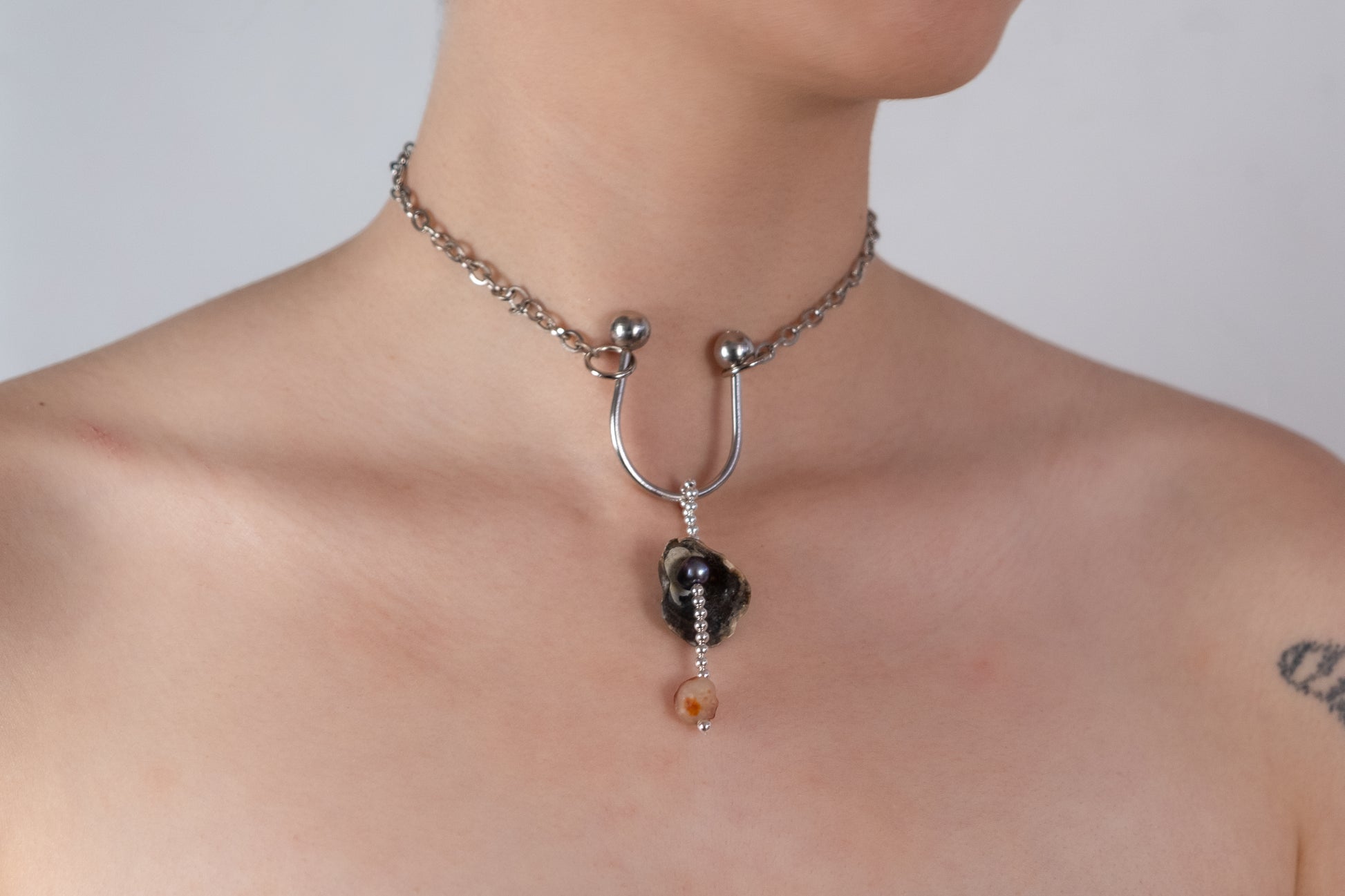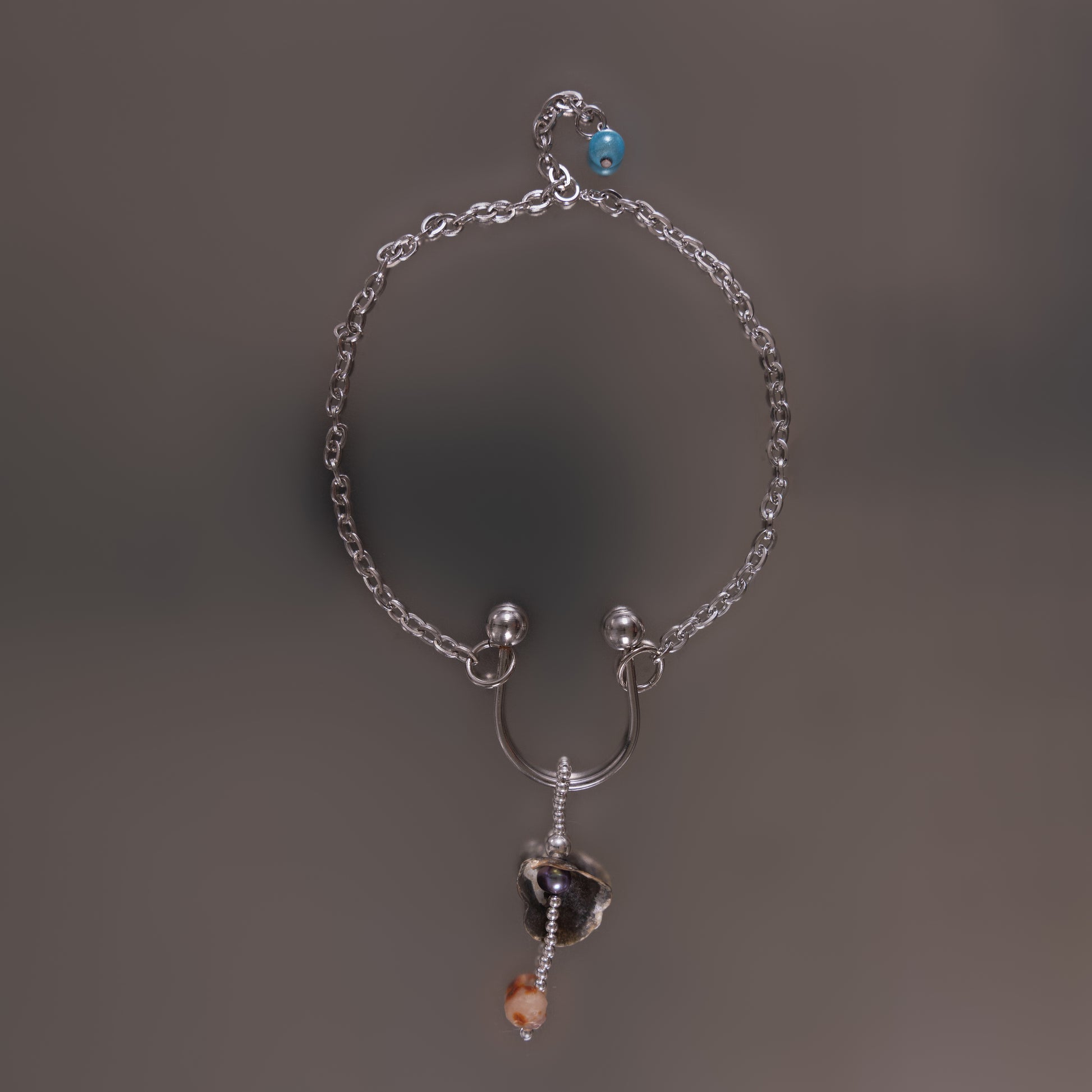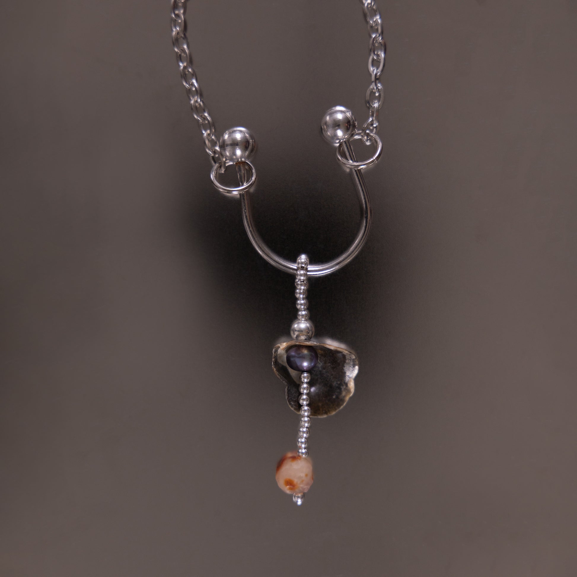 stainless steel, silver beads, cultured pearl, seashell, stone.